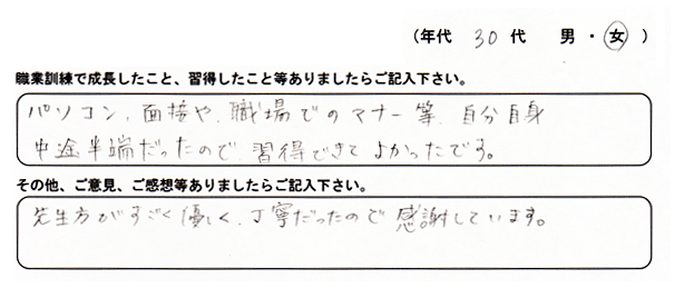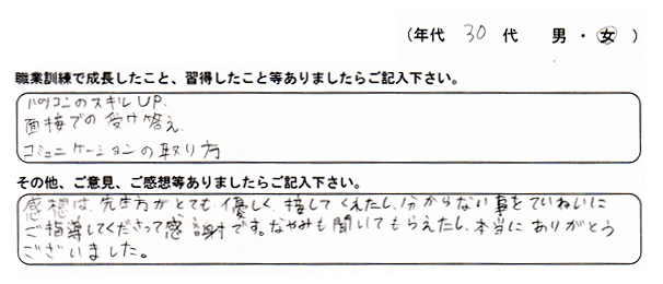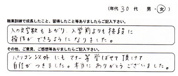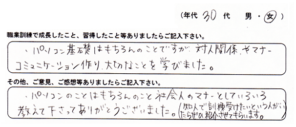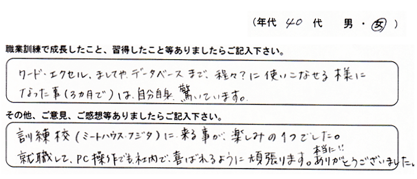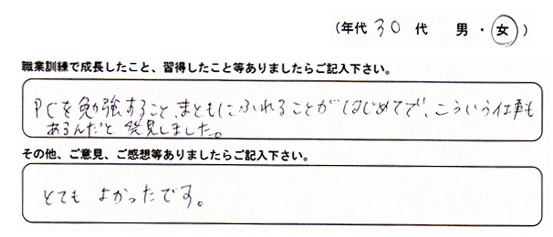 「パソコンの専門分野だけでなく、掃除やお茶の出し方などたくさんの事を知り成長しました。家に帰って家族に自慢したい。」