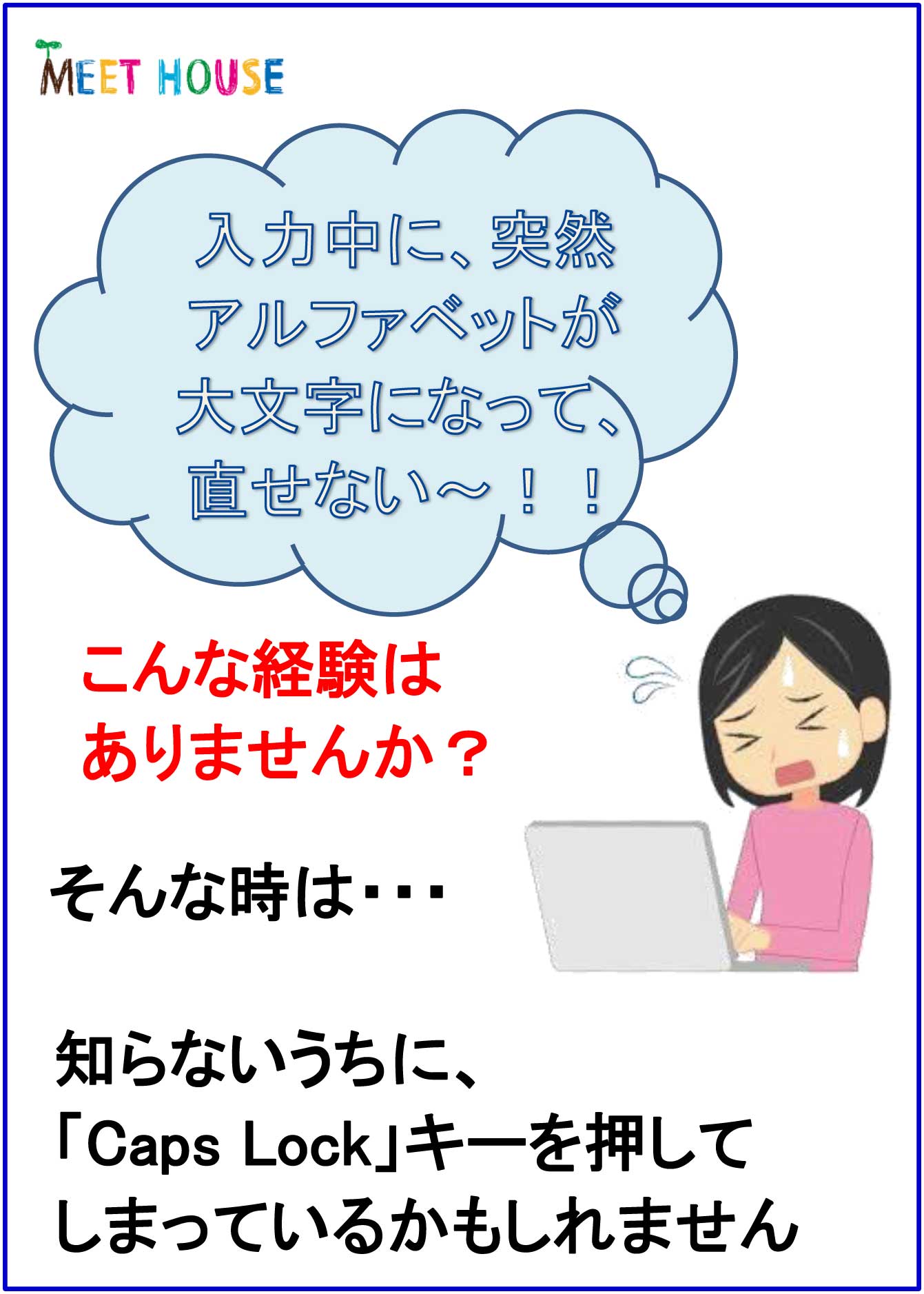 お知らせ エクセルの小技「Caps Lockキーについて」 2019.10.30 by meethouse 0 エクセルの小技「Caps Lockキーについて」 入力中に、突然アルファベットが小文字から大文字になって直せない! こんな経験はありませんか? そんな時は、「Caps Lock」キーを押してしまっているかもしれません。 今回は、「Caps Lock」キーについてご説明します。 このように、キーの意味を知ると、自分で問題解決できますね! ぜひ、みなさんも試してみてくださいね。(*^-^*)
